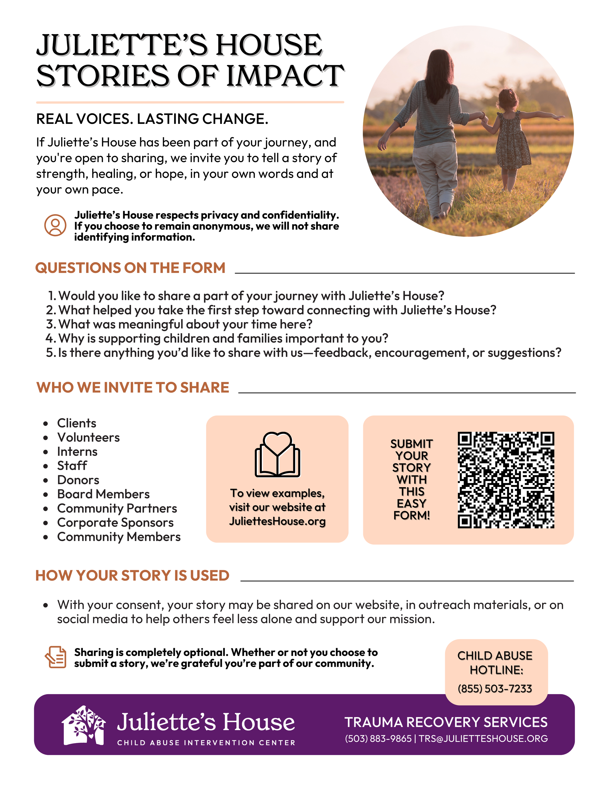 At Juliette’s House, every story matters. Whether you’re a donor, volunteer, intern, partner, or survivor—your voice reflects the heart of our mission: to prevent child abuse, promote healing, and protect children. If Juliette’s House has impacted your life, or if you have a story of overcoming abuse or adversity, we invite you to share it. Your story can spark change, inspire others, and remind survivors they’re not alone.